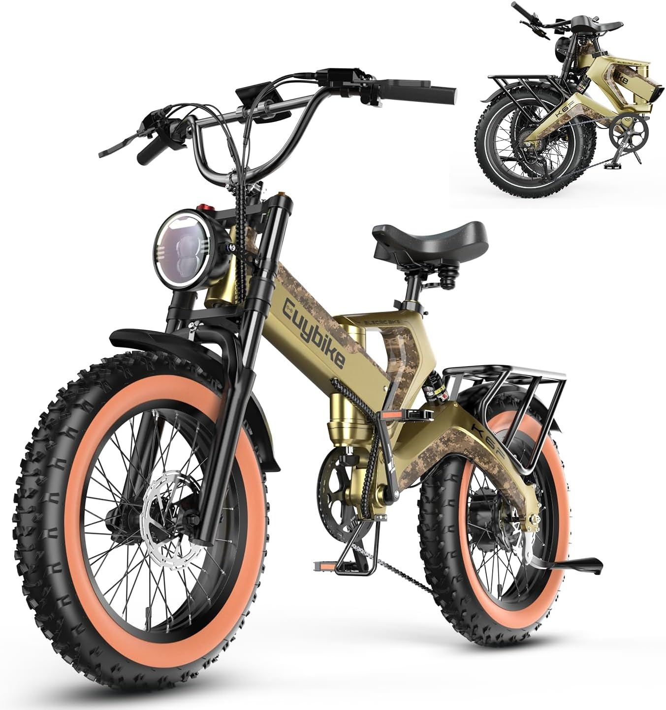 Equipped with 20″ x 2.6″ tires and a 500W peak motor powered by a 48V/7.8Ah battery, enabling speeds up to 20 mph for versatile riding.